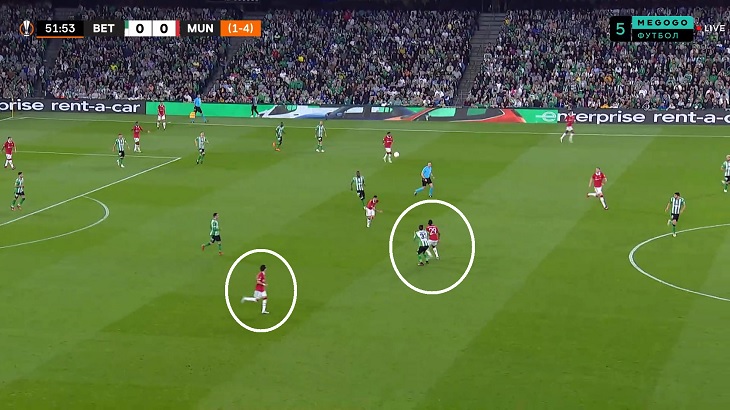 Уходил в центр, открывая фланг правому защитнику, то играл максимально широко, заставляя Уан-Биссаку и затем Далота смещаться в центр.