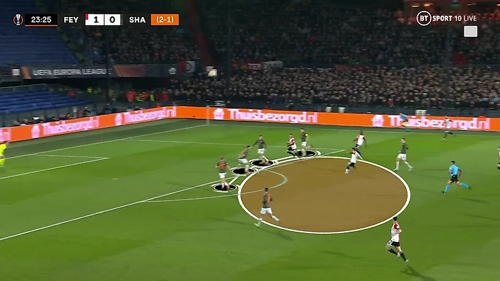 Подобное бывало и в других матчах «Шахтера». Обычно это не катастрофа – против большинства соперников даже верная реакция на потерю (выбор цельности защиты, а не нейтрализации дальней угрозы), но «Фейеноорд» грандиозно карал за подобные дыры около штрафной.