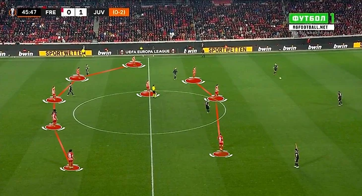 В чем оригинальность? «Фрайбург» оборонялся именно 5-1-3, а не 5-3-1. Крайние нападающие Хелер и Доан продолжали вместе с Грегоричем ориентироваться на тройку центральных защитников «Ювентуса», оставляя опорника Хефлера одного на гигантском пространстве. Звучит суицидально, но в этом был смысл.