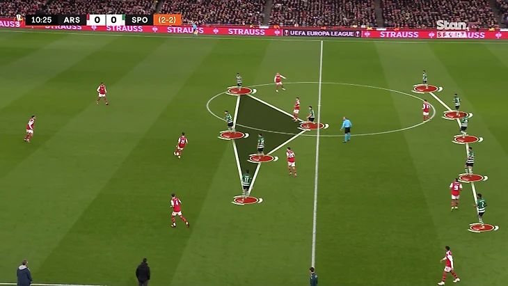В рамках этой схемы «Спортинг» качественно перекрывал центр через смещения пятерки. Поте был их частью, но индивидуальные оборонительные качества почти не проверялись. Такая структура толкала «Арсенал» играть, минуя чужую опорную зону – доставлять мяч напрямую в последнюю линию после стартовых перепасовок: