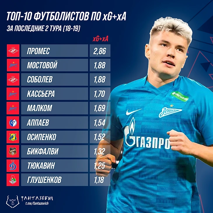 Топ-10 футболистов по xG+xA (вероятные голы и ассисты) за 18-19 туры.