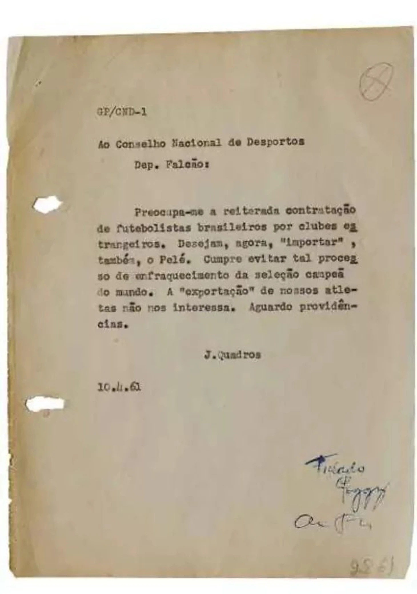 Хотя ничто не мешало «Сантосу» урезать зарплату. В 1961 году был принят закон президента Бразилии Жаниу Куадроса, объявляющий Пеле национальным достоянием и запрещающим ему играть за границей.