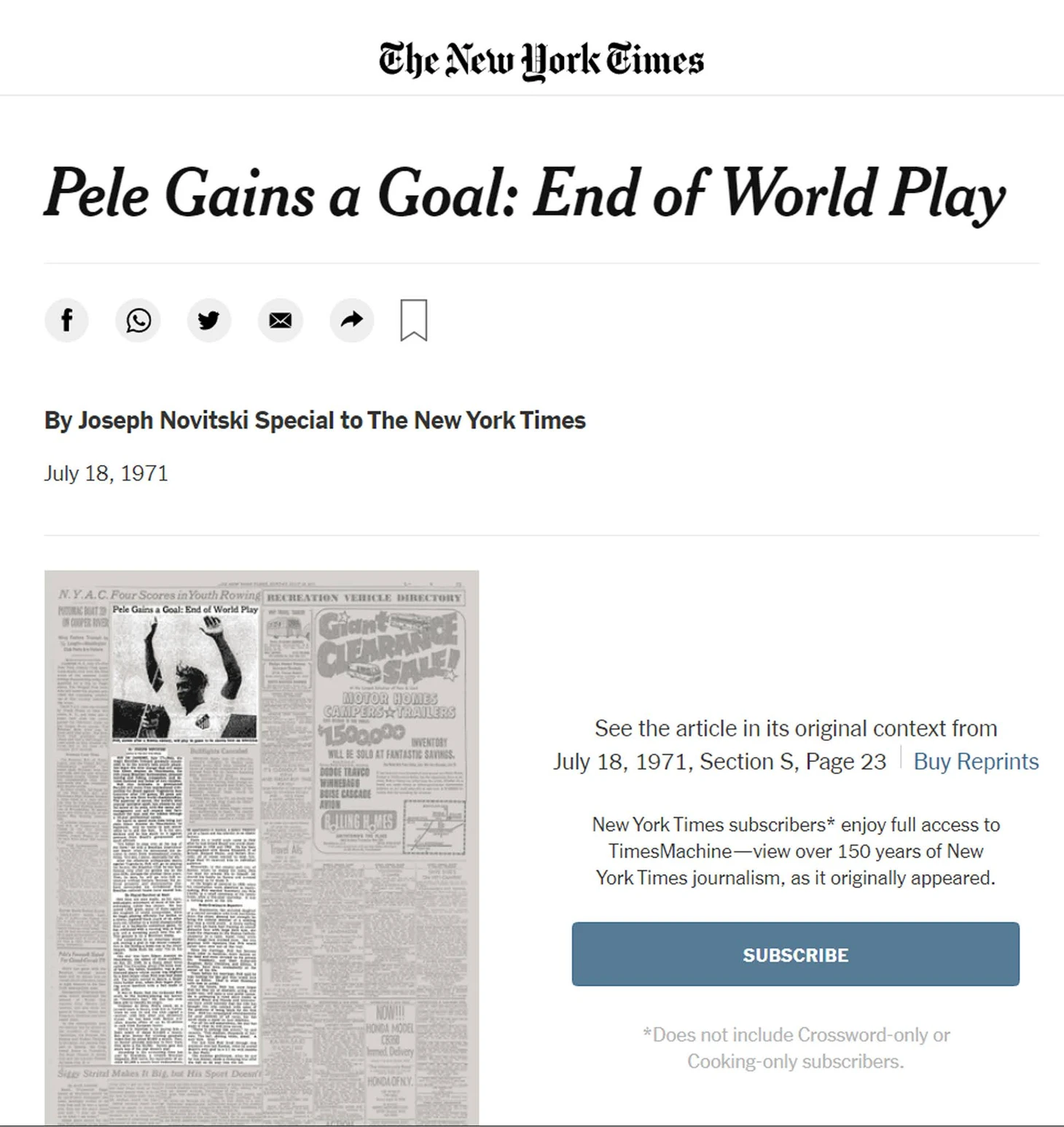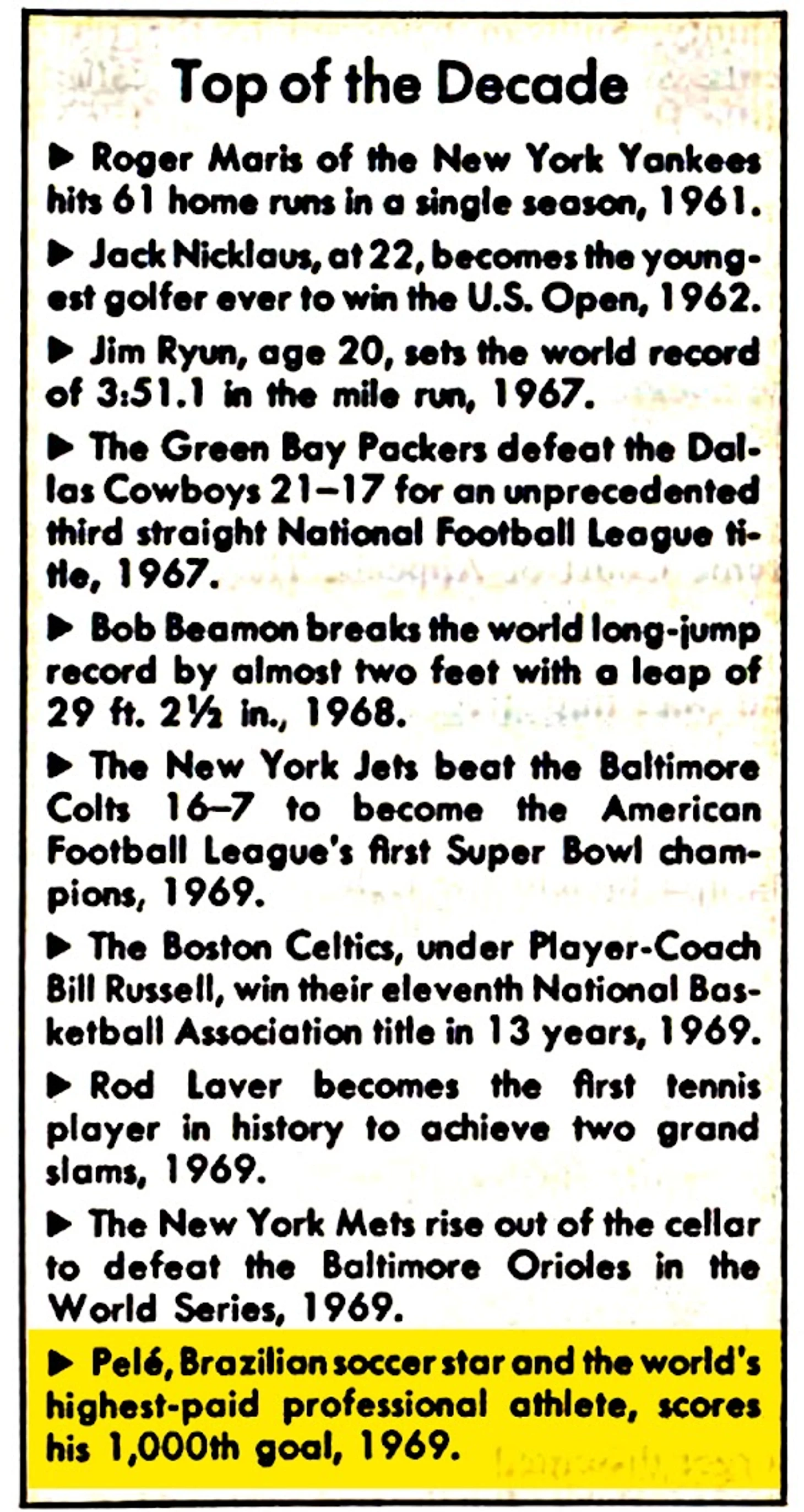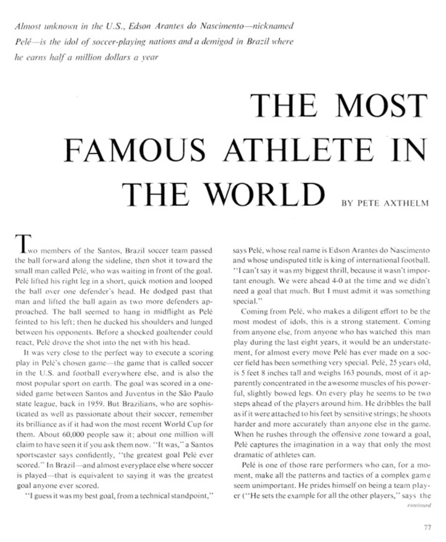 «О его удаче ходят легенды среди любителей футбола. Сын игрока лиги из северной части штата, который зарабатывал 4,50 доллара за игру, Пеле теперь зарабатывает более 200 000 долларов в год в виде заработной платы и бонусов. Он владеет несколькими прибыльными предприятиями и является героем двух книг и фильма. Его общий доход составляет около полумиллиона долларов.»