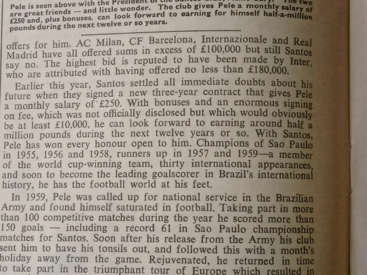 «Сантос» платит ему базовую зарплату в размере около 15 000 долларов в месяц. Но есть еще призовые деньги, которые обычно составляют сумму примерно 5000 долларов в месяц. Также в товарищеских играх «Сантоса» в Нью-Йорке Пеле зарабатывает кругленькую сумму в 2500 долларов США за матч. А согласно отчету надежного бразильского журнала Realidade за прошлый год, Пеле зарабатывал дополнительно 21 000 долларов США в месяц за счет спонсоров, плюс у него 60 квартир в Сантосе, работа по связям с общественностью в банке и своя доля в фабрике по производству резины.»