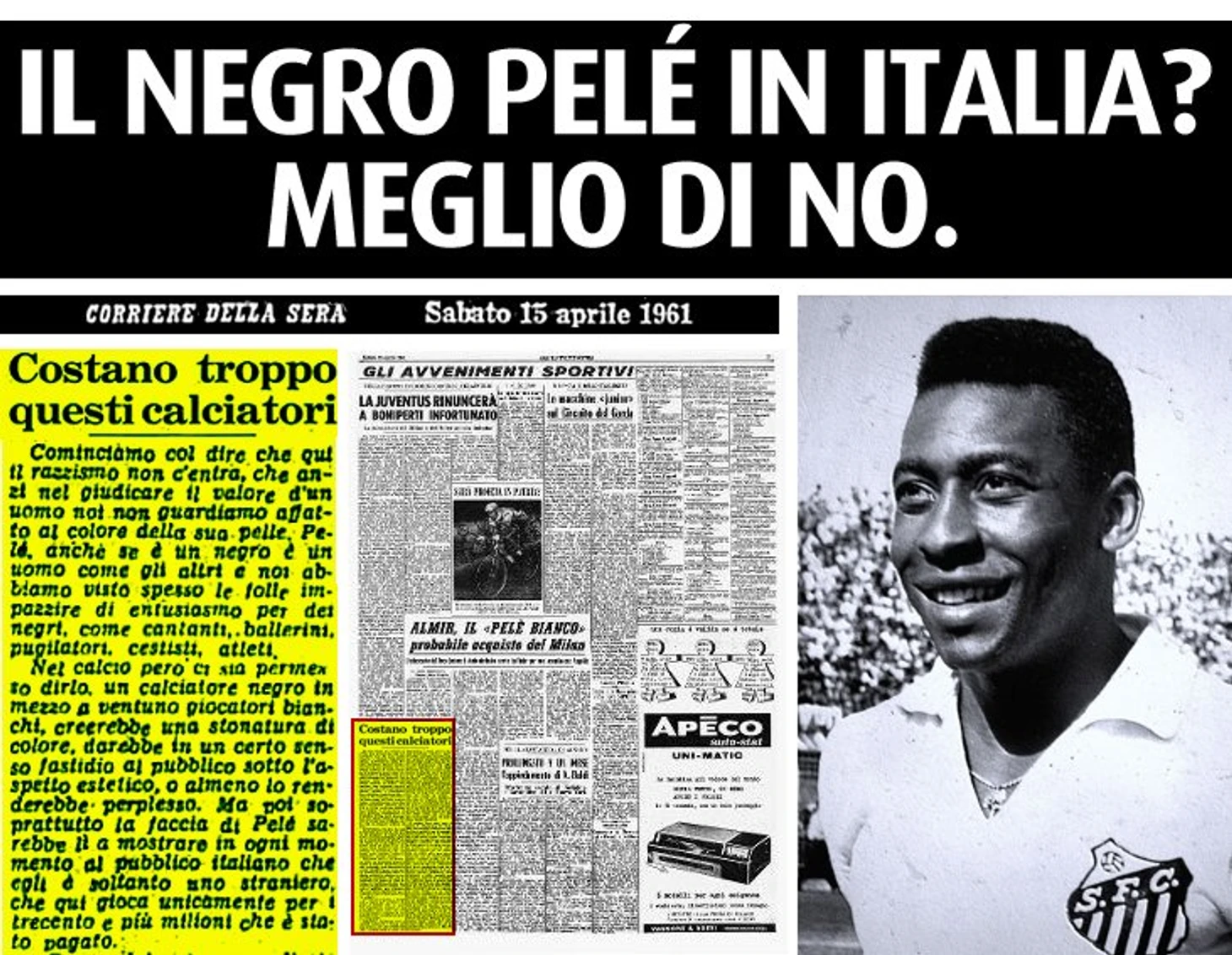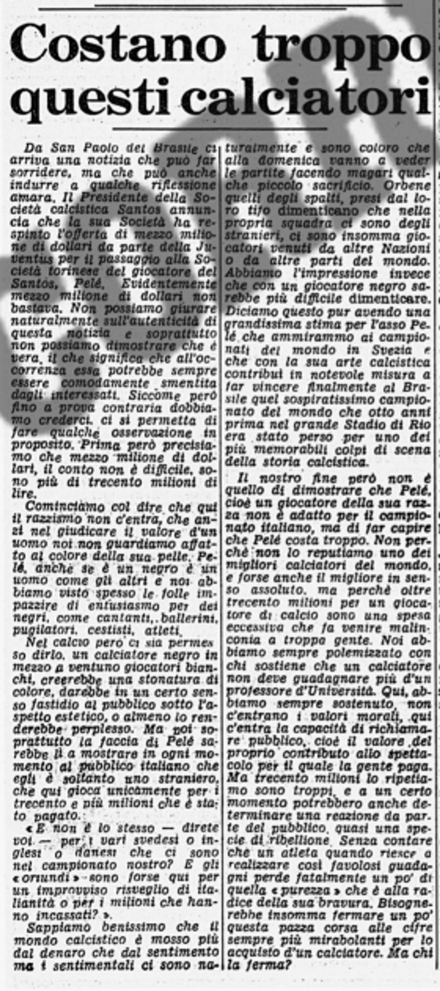Все знают что «Ювентус» не купил Пеле за космические по тем временам полмиллиона долларов, но что писала 15 апреля 1961 года в субботнем выпуске Corriere della Sera? Дело дуче жило и процветало даже в центральной прессе спустя 17 лет после смерти Муссолини.