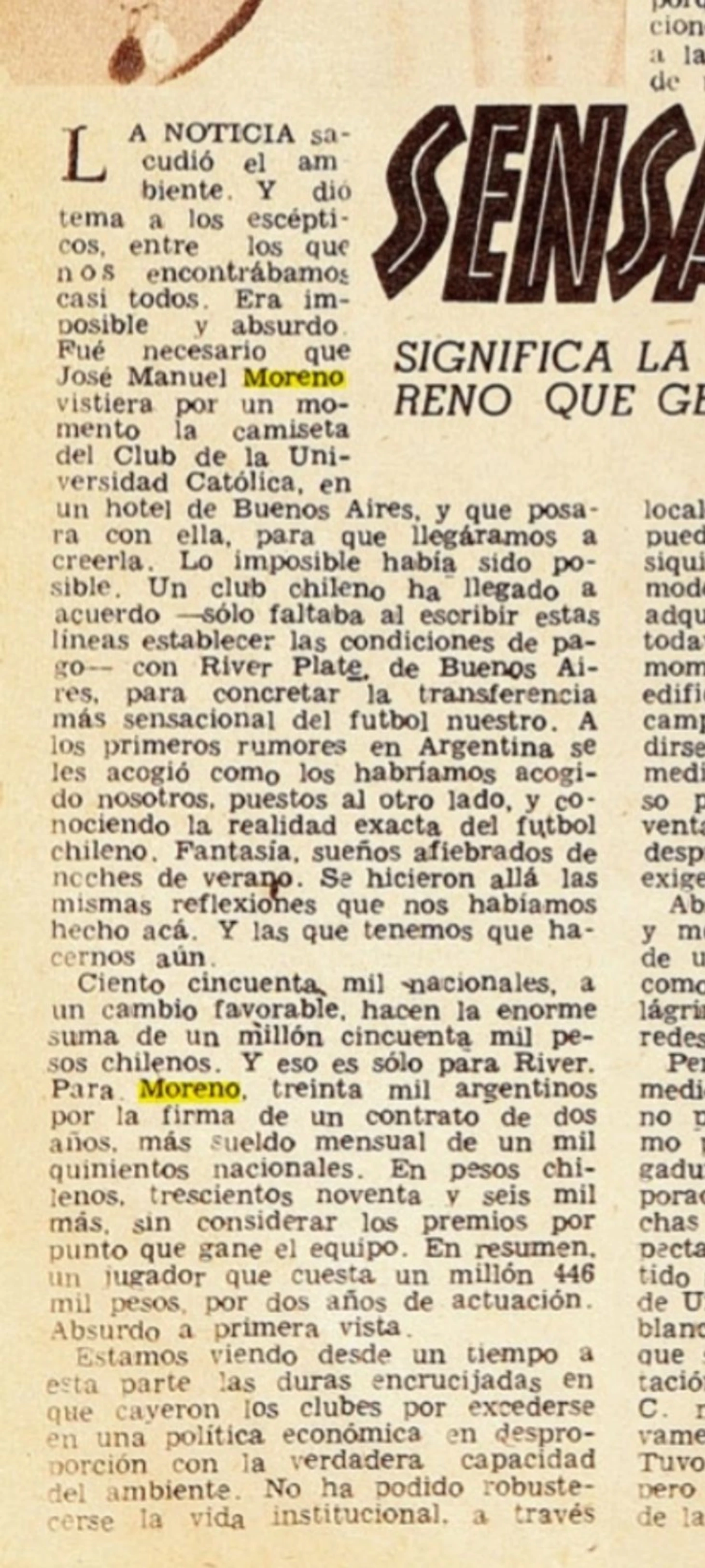 Чилийский «Универсидад де Католика» в 1949 году купил великого, но уже возрастного Чарро Морено за 1 446 000 чилийских песо (тогдашний курс 1*1600), то есть за примерно 904 доллара. Но где послевоенный Чили и Бразилия 60-ых?