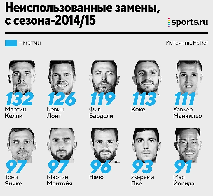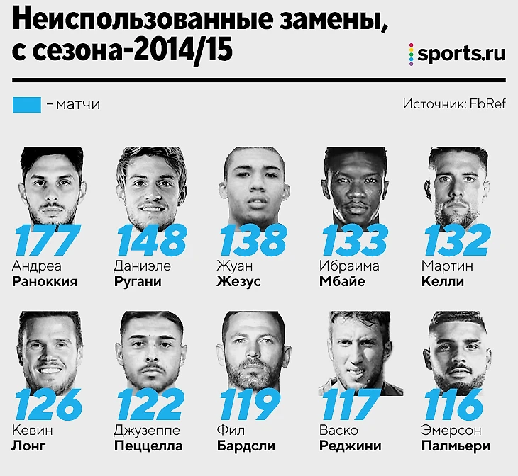 Fbref обсчитывает данные с сезона-2014/2015 – вот так выглядит топ-10 футболистов, которые попадали в заявку на матч, но не выходили на поле. Важное уточнение: в списке только полевые игроки – иначе всю десятку занимали бы резервные вратари.