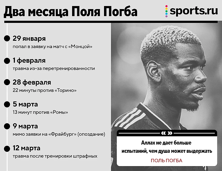 2 месяца Погба: травма, 35 минут футбола, опоздание и еще одна травма