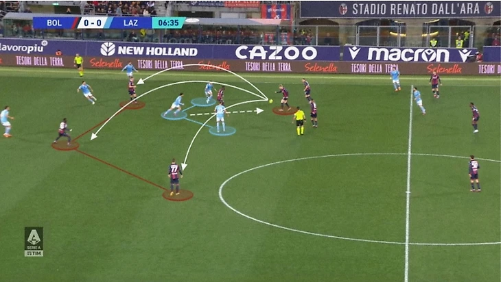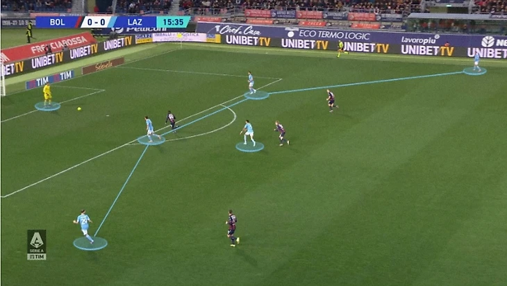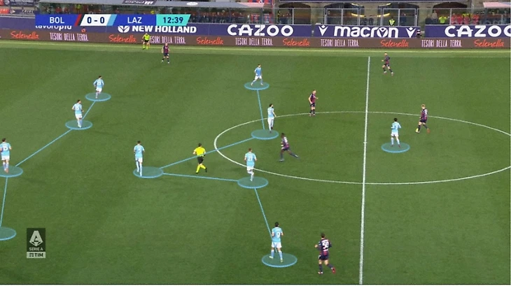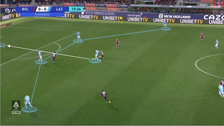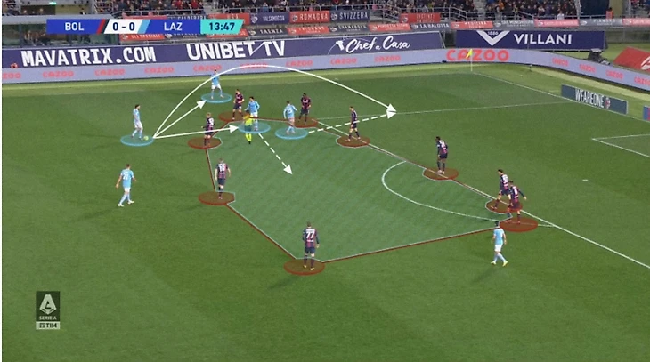 При ударе от ворот один из центральных защитников передает мяч вратарю. Это позволяет мячу находиться в центральной зоне, поэтому команды не могут заставить «Лацио» пойти в одну сторону и закрыть их.