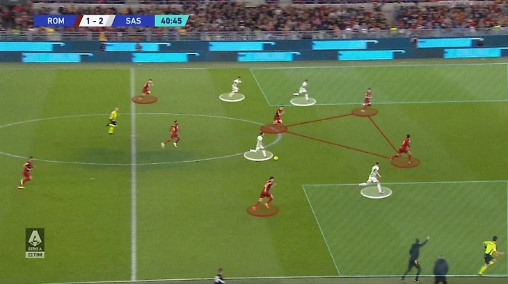 Из-за того, что полузащитнику приходится преодолевать большое расстояние, чтобы прессинговать мяч, у защитников, владеющих мячом, есть достаточно времени, чтобы отыграть передачу. К тому времени, когда полузащитник прессингует центрального защитника, мяч уже находится у другого игрока, и другим игрокам «Лацио» приходится карабкаться, чтобы закрыть пустые места. Это оставляет 3 на 1 в тех широких зонах, где «Роме» очень легко продвигать мяч и начинать атаку.