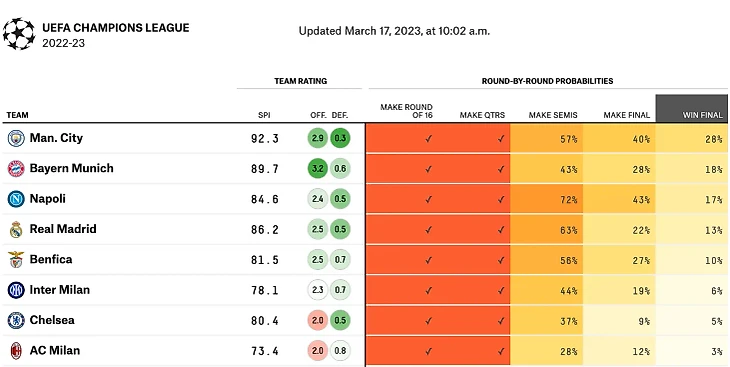 • Хоть суперкомпьютер уверен, что мадридский «Реал» пройдет в полуфинал, ожидается, что они не допрыгнут до финала – проиграют кому-то из пары «Сити» – «Бавария».