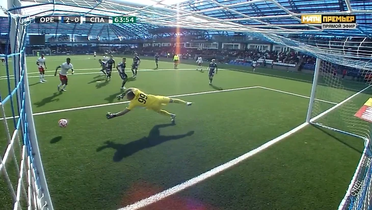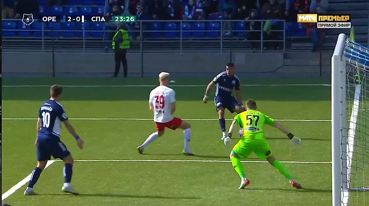 Умудряются футболисты Спартака на своей половине поля допустить ошибку теряют мяч. Дали возможность футболистам Оренбурга нанести удар по воротам, вратарь на месте.