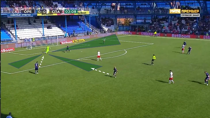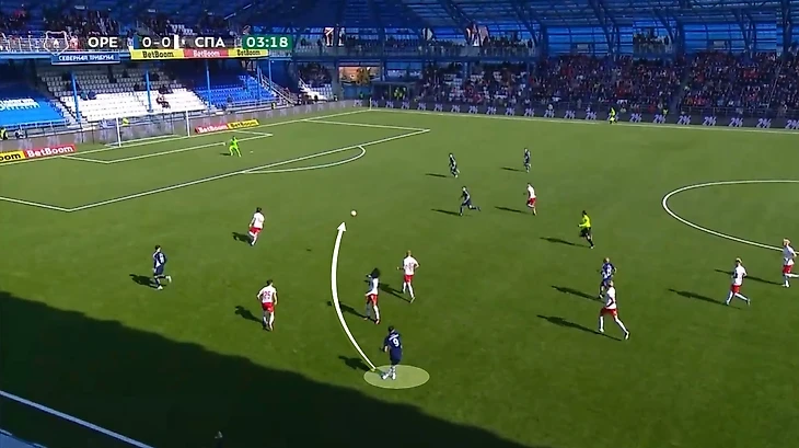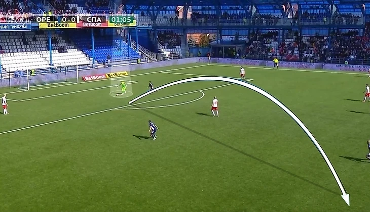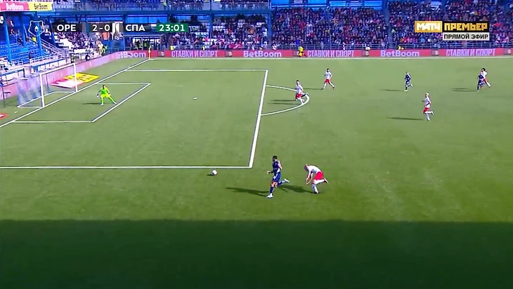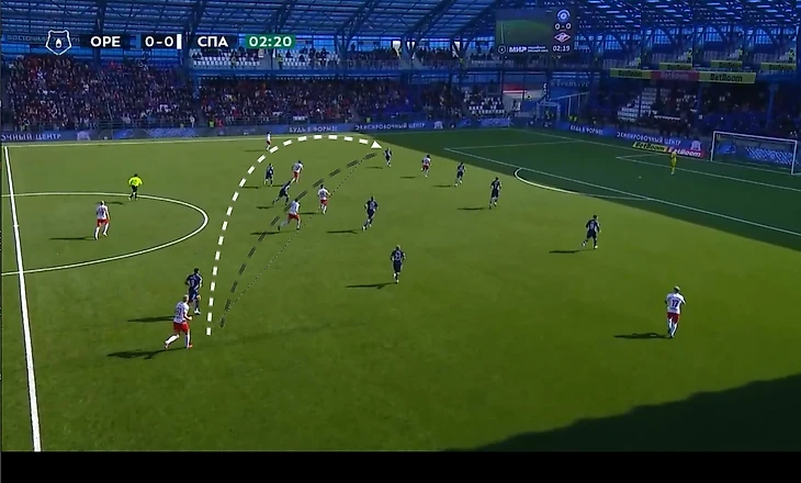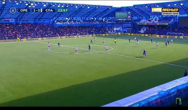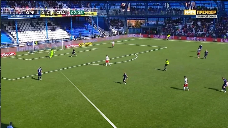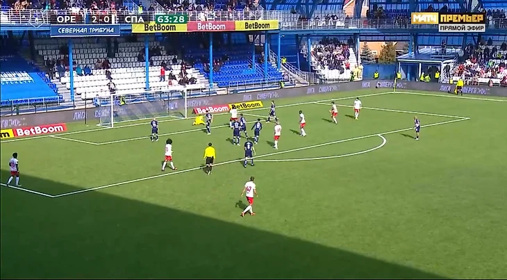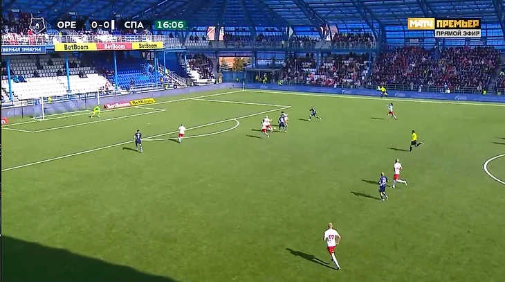 Тактический безграмотно играет Спартак, бесконечные забросы в плохом исполнении, которое приводит к потере мяча. Защитники Оренбурга теряют мяч на своей половине поля. По всей видимости футболисты Оренбурга не знают как уходить от прессинга и поэтому посылают мяч в борьбу. Но в отличие от Спартака в борьбе за мяч они чаще выигрывают, и мяч остаётся у них.