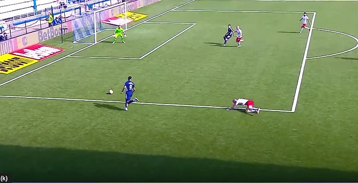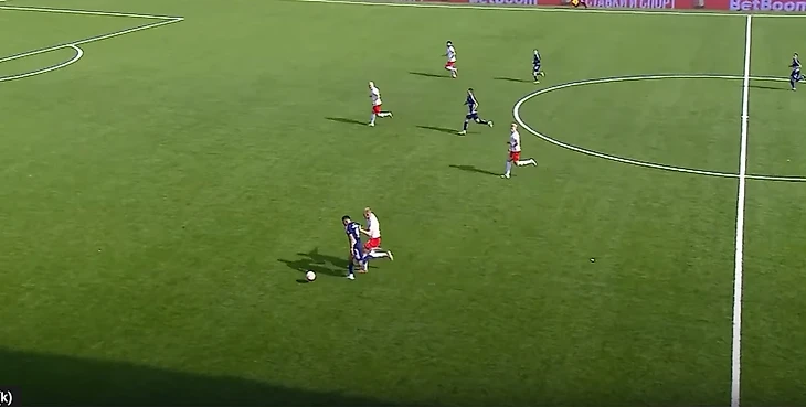 далее на левом фланге Брайан Мансилья убежал от Даниила Денисова, выиграв у него силовую борьбу плечо в плечо, затем аргентинец вошёл в штрафную и зряче прострелил