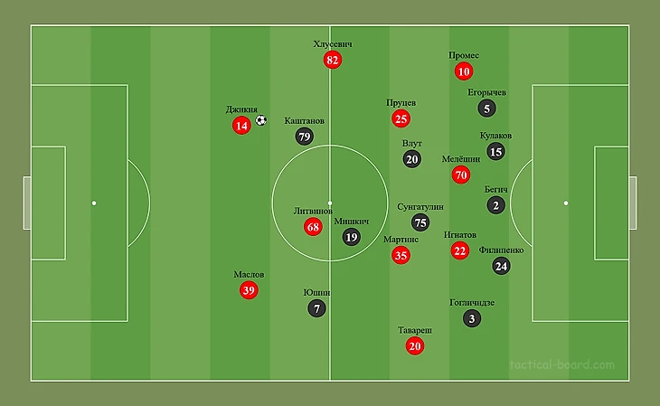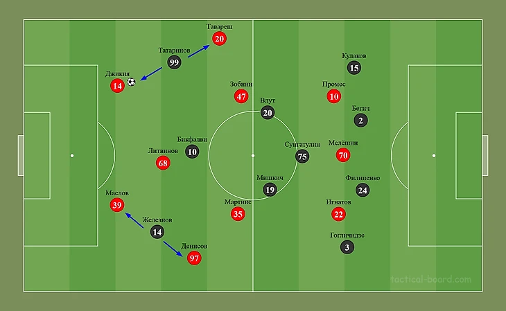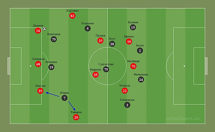 В предыдущем матче против «Спартака» у «Урала» возникли проблемы именно в этот период, когда на высокий прессинг уже не хватало сил, и поэтому некоторые игроки отходили назад, а некоторые всё ещё старались оказывать давление. Такие смешанные реакции – самая большая проблема в организации прессинга. Видимо, Гончаренко хотел избежать этого за счёт ещё большей плотности в центре (теперь там было сразу три игрока), но при этом попытки прессинга были совсем неудачными: несмотря на то, что в атакующей тройке все игроки только что вышли на поле, преимущество «Спартака» в 2 игрока в первой линии было слишком велико. Хозяева очень легко начинали позиционные атаки и вскоре, чтобы увеличить давление на чужой половине поля, Абаскаль выпустил Зиньковского, который уже много раз хорошо показывал себя в ситуации, когда команде не удаётся регулярно доставлять мяч в штрафную соперника.