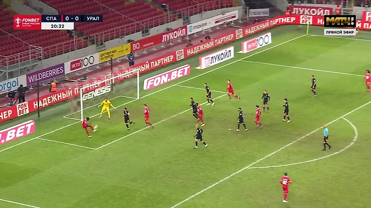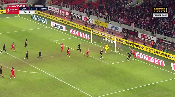 В штрафной может ситуация 4 против 3 в пользу «Спартака». В итоге во время скидки Литвинова на линии вратарской 3 против 2, а удар нанёс Промес, который сам же успел набежать на этот мяч.