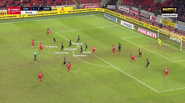 Когда «Урал» шёл в давление на чужой половине поля, Мишкич поднимался на одну линию с Каштановым. Если «Спартак» образовывал тройку в первой линии (чаще всего опускался Литвинов), к ним присоединялся Юшин. Но теперь в первой линии прессинга не было чёткой игры 1 в 1. Гончаренко дал Юшину необычную установку: Александр всё время располагался между правым и крайним центральным защитником, только имитируя прессинг.