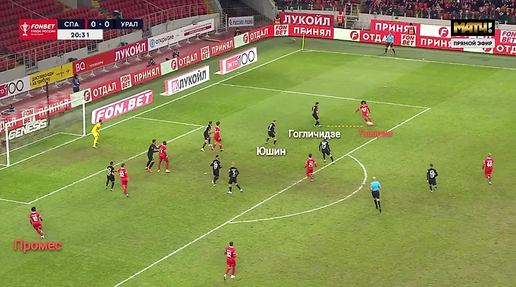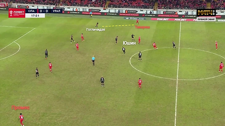 Так «Уралу» удалось здорово провести стартовый отрезок. Проблемы начались когда игроки «Спартака» стали перегружать последнюю линию. Из тройки полузащитников туда поднимался Мартинс, и хозяева создавали ситуацию 4 в 4. Защитники «Урала» всё так же смещались, не создавая пространства для проникающей передачи, но теперь на правом фланге постоянно оставался один Промес.