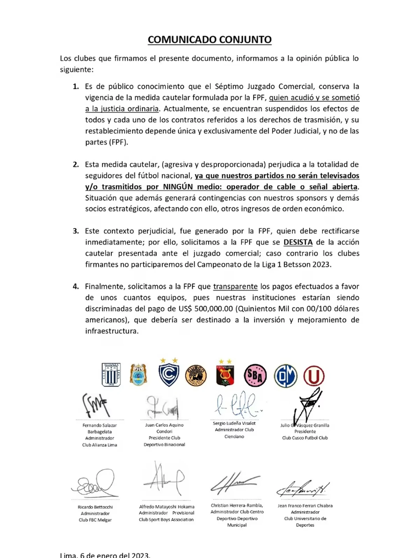 6 января 2023 года восемь клубов (Альянса Лима, Депортиво Бинасьональ, Сьенсиано, ФК Куско, Мельгар, Университарио, Спорт Бойз и Депортиво Мунисипаль) выпустили совместное заявление, в котором выставили ультиматут и отказались принимать участии в Лиге 1, до тех пор, пока Федерация не отменит меру пресечения на новые контракты клубов с GOLPERU.