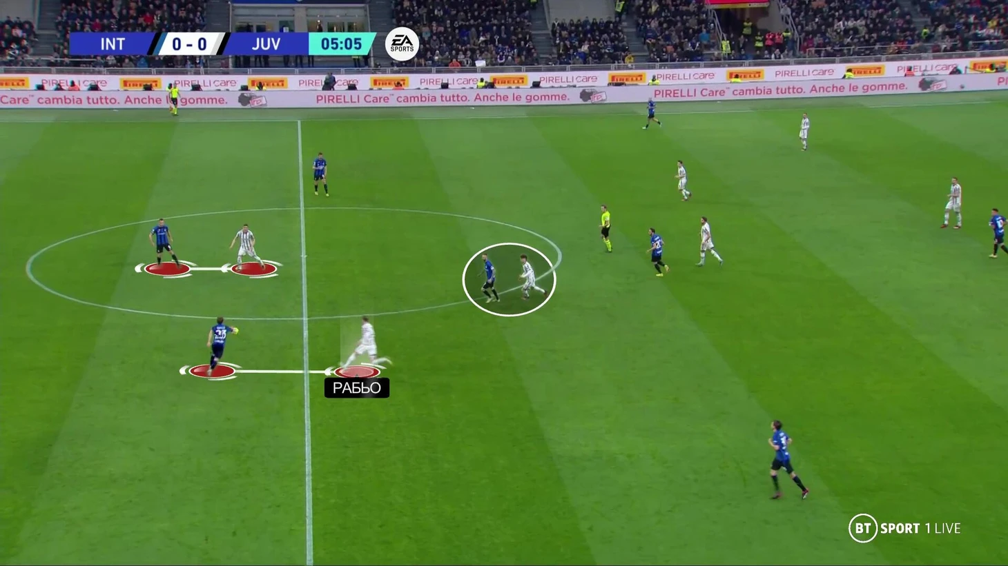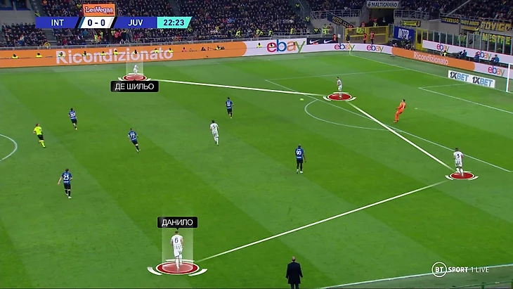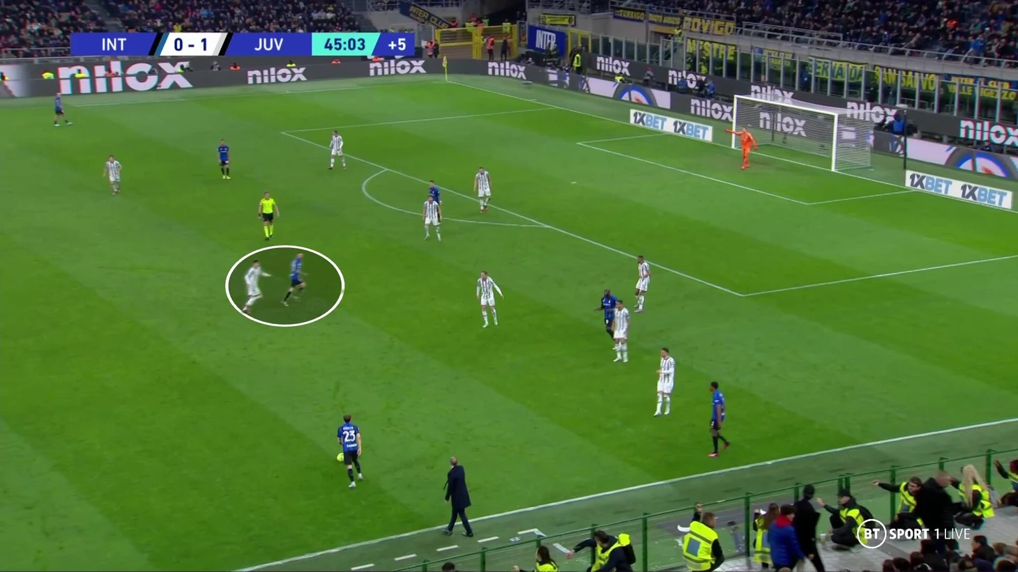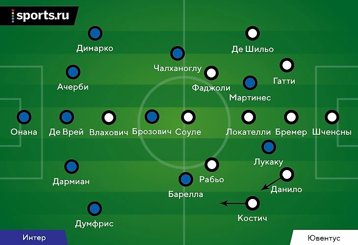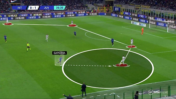Такая трансформация позволяла закрывать «Интеру» любимые направления, контролировать их атаки, при этом не оставаться в меньшинстве в середине даже после выдвижения (два полузащитника «Ювентуса» оставались против Чалханоглу и Бареллы).