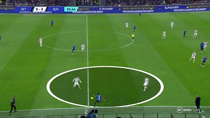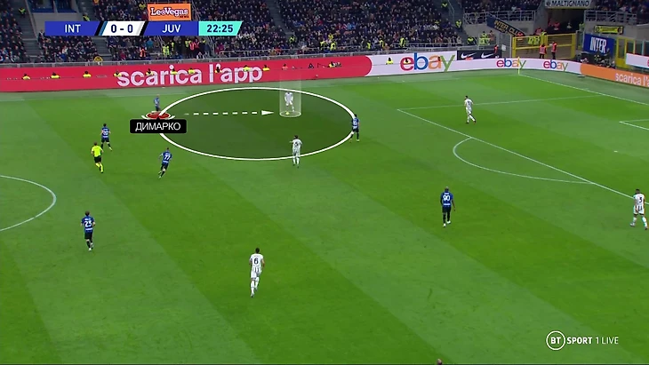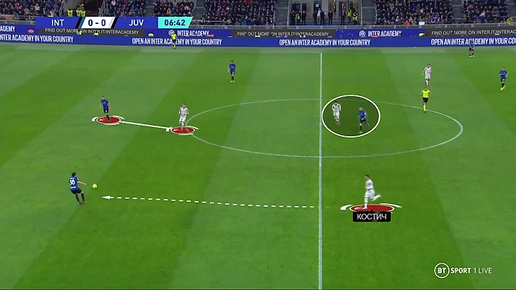 Для «Интера» частыми были два варианта продолжения. Первый – центральный защитник оставался без вариантов и отдавал пас назад. Второй – под давлением пасовал на фланг, где у «Юве» замыкалась ловушка. В этом моменте Костич (по ситуации он на месте Рабьо) выдвигается: