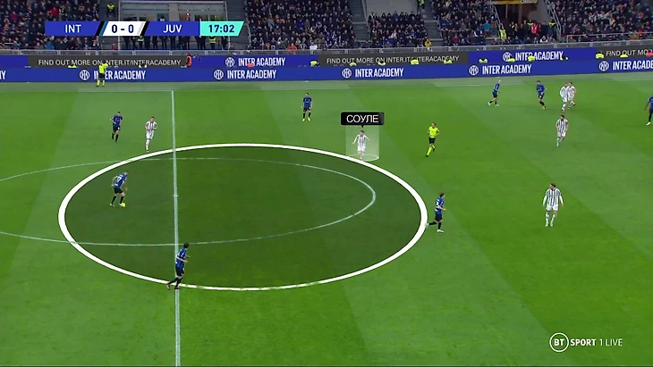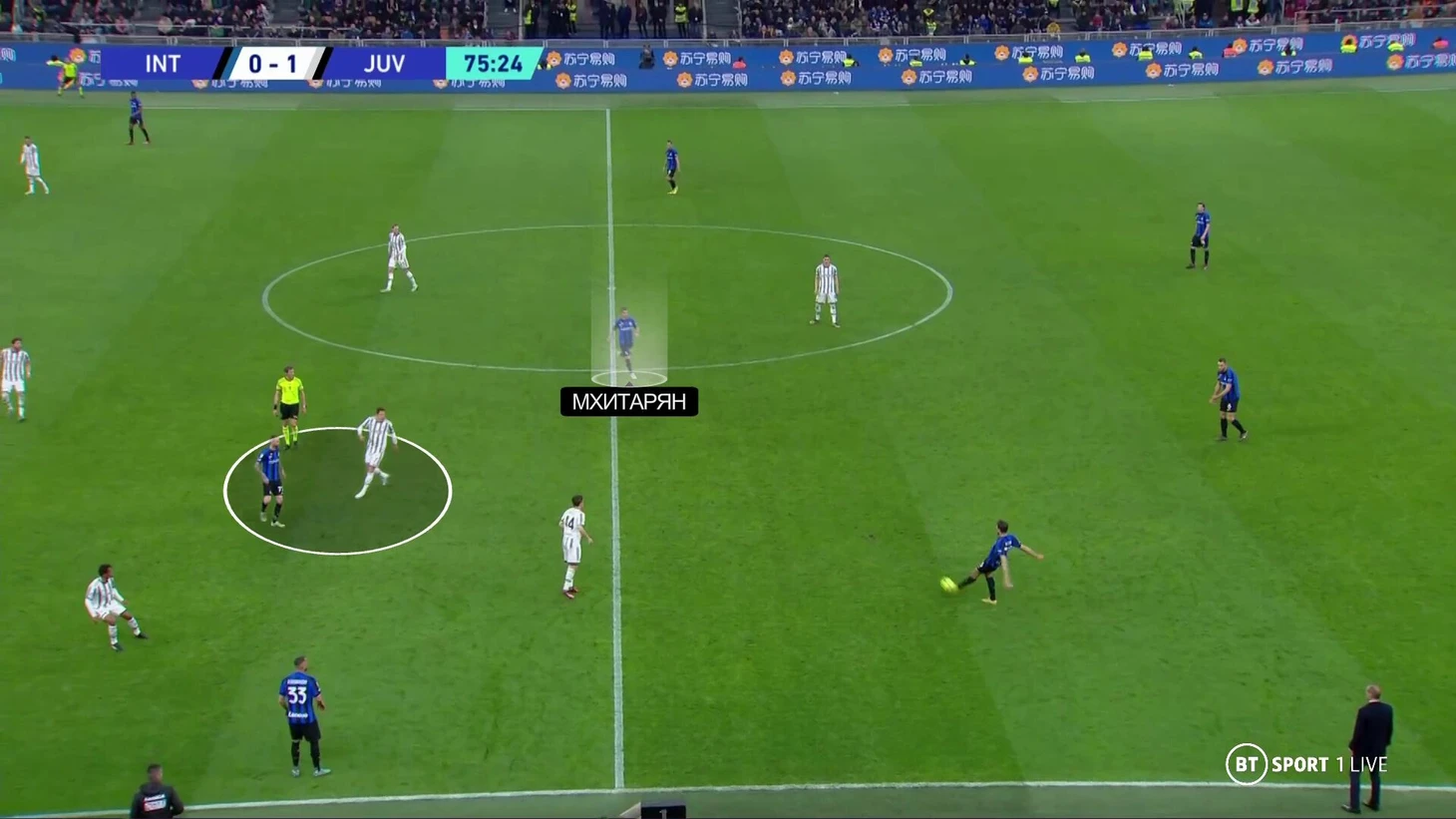 Базовым сценарием встречи стало сдерживание «Ювентусом» розыгрышей «Интера» в центре поля. Команда Аллегри регулярно ловила соперника в однотипную ловушку. Соуле персонально перекрывал Брозовича, Влахович играл по Де Врею, а один из центральных полузащитников выдвигался, чтобы надавить на центрального защитника с мячом. Справа эту работу проделывал Николо Фаджоли: