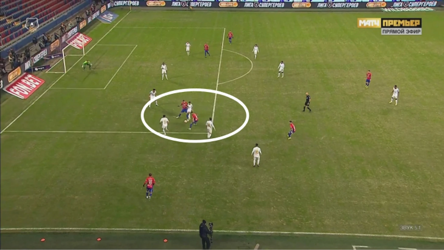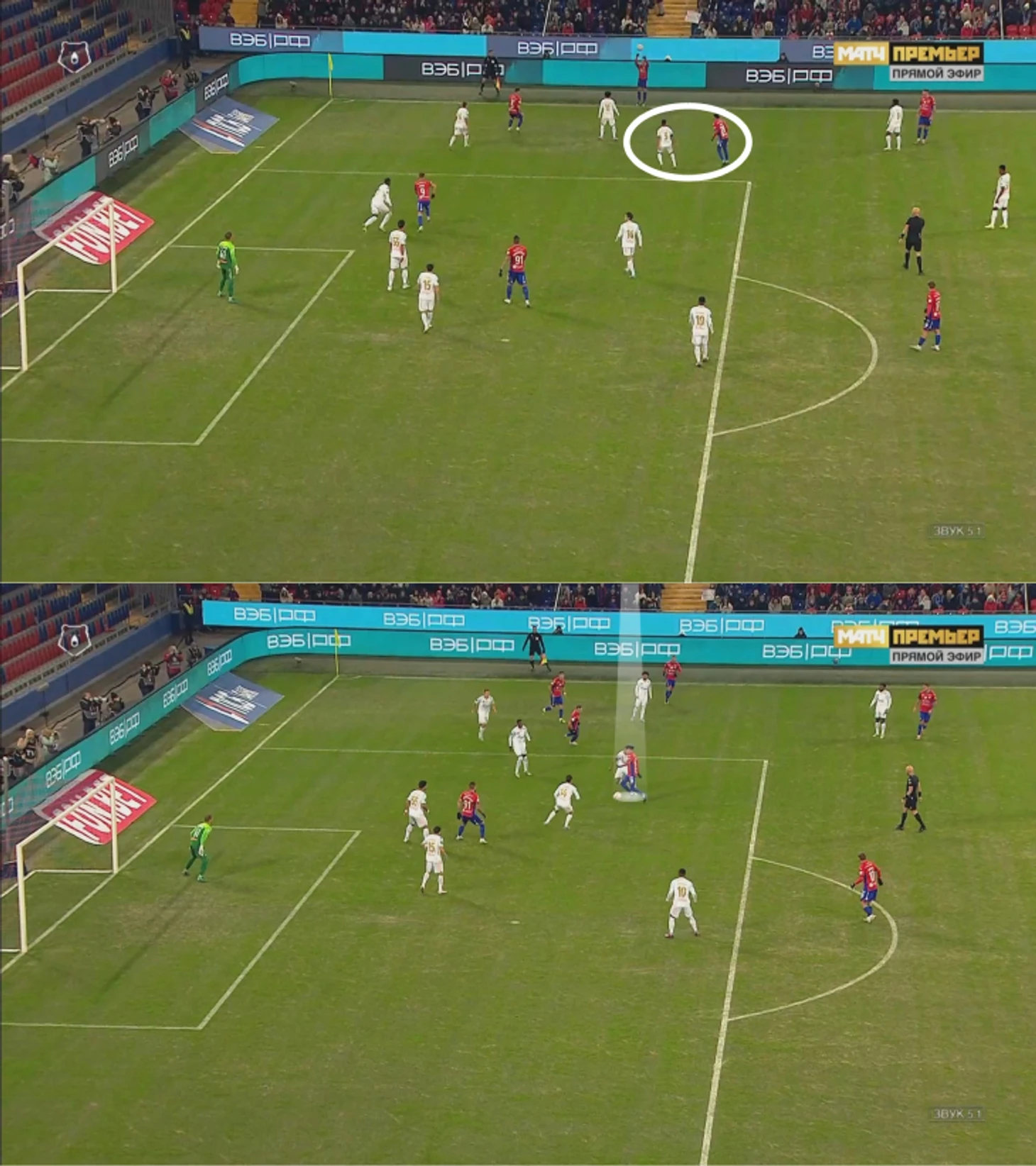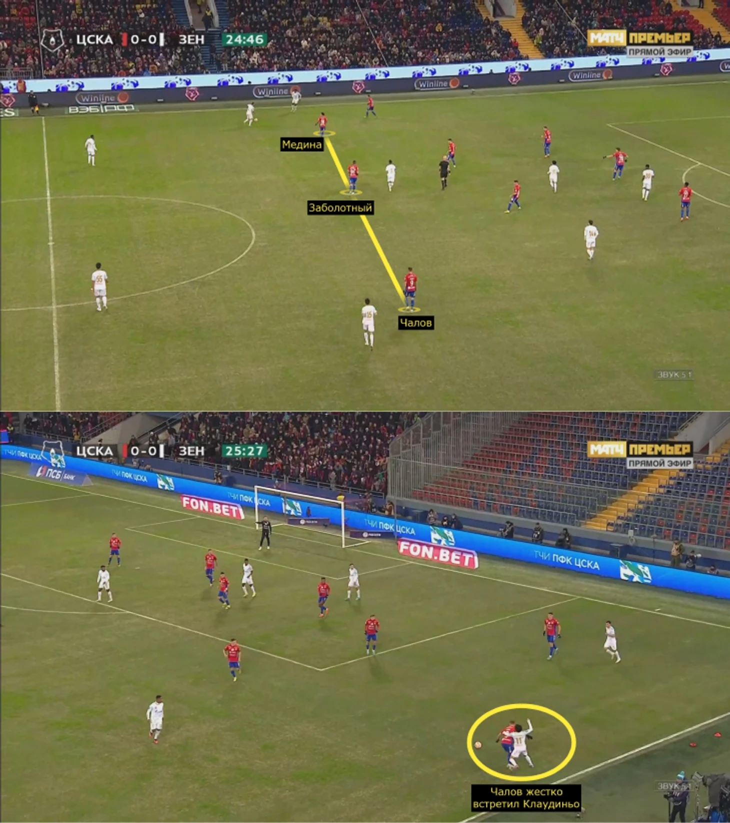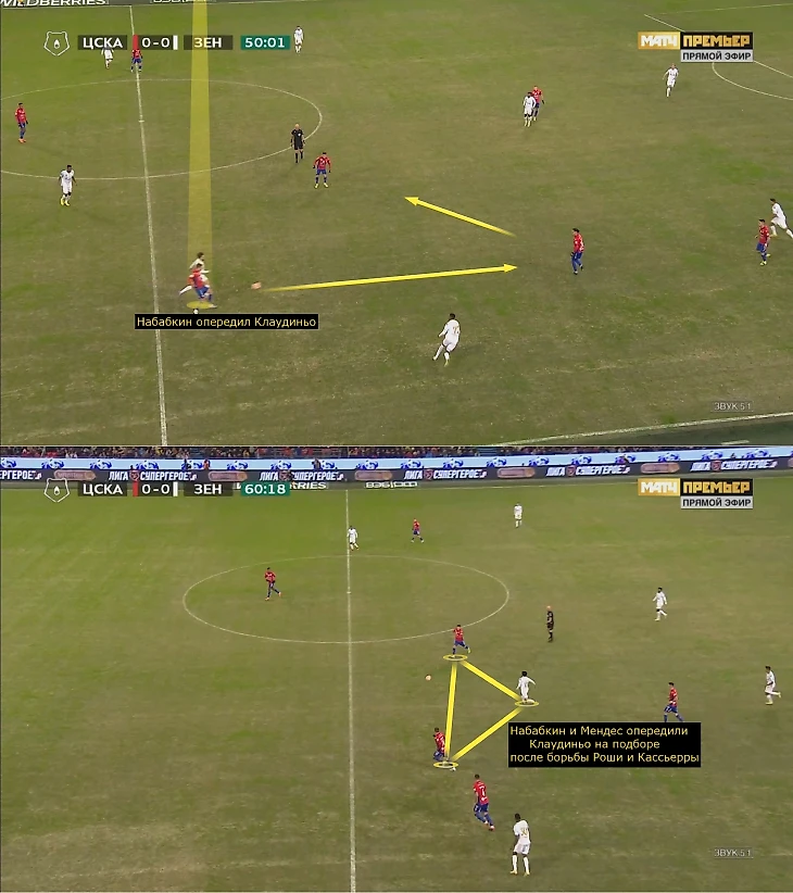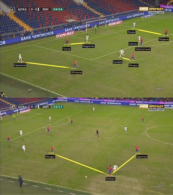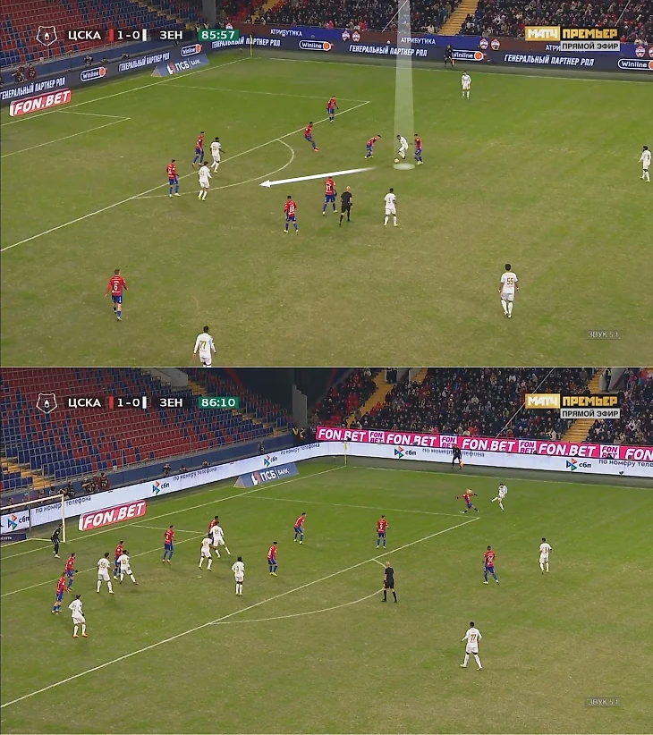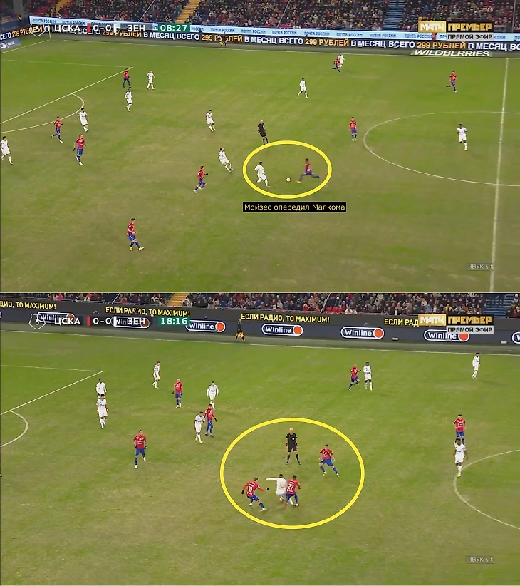 ЦСКА агрессивно загонял «Зенит» во фланговые прессинг-ловушки, где главная цель – персональная игра и создание максимальной плотности, чтобы не позволять разбегаться и комбинировать. Обычно при передаче на край включались латераль, опорный полузащитник и крайний центральный защитник – здесь видно, как ЦСКА разобрал зенитовцев 1-в-1, Мойзес опередил Малкома, а ситуацию дополнительно страховал Здьелар.