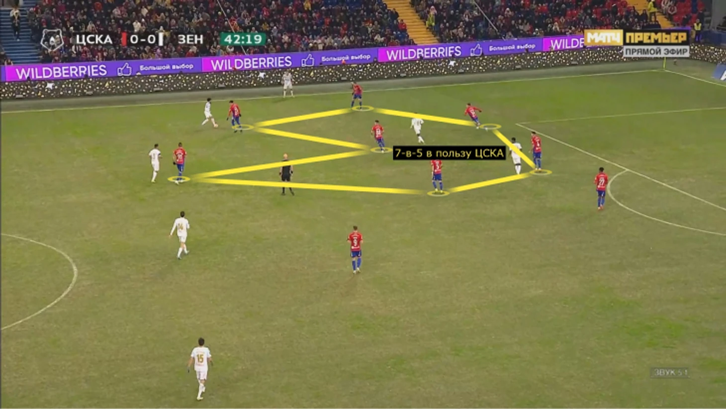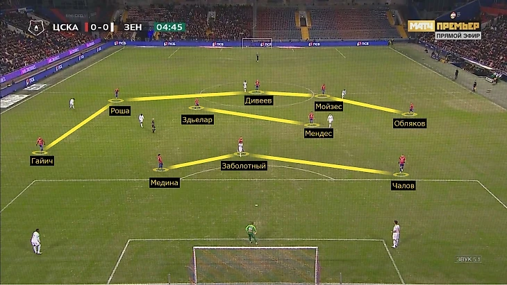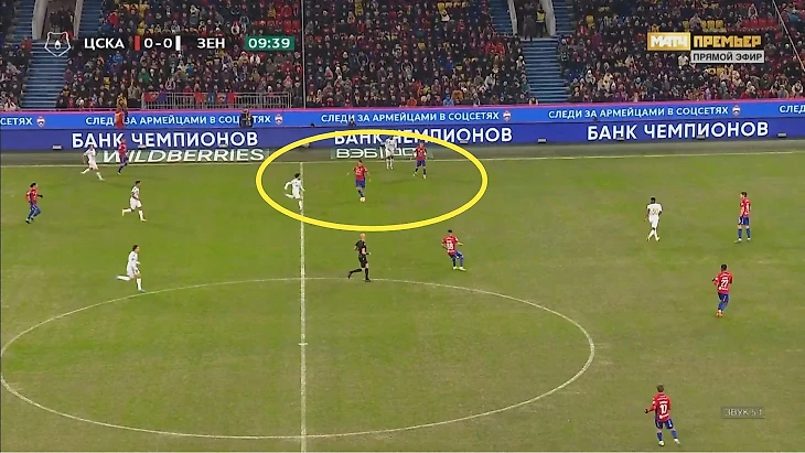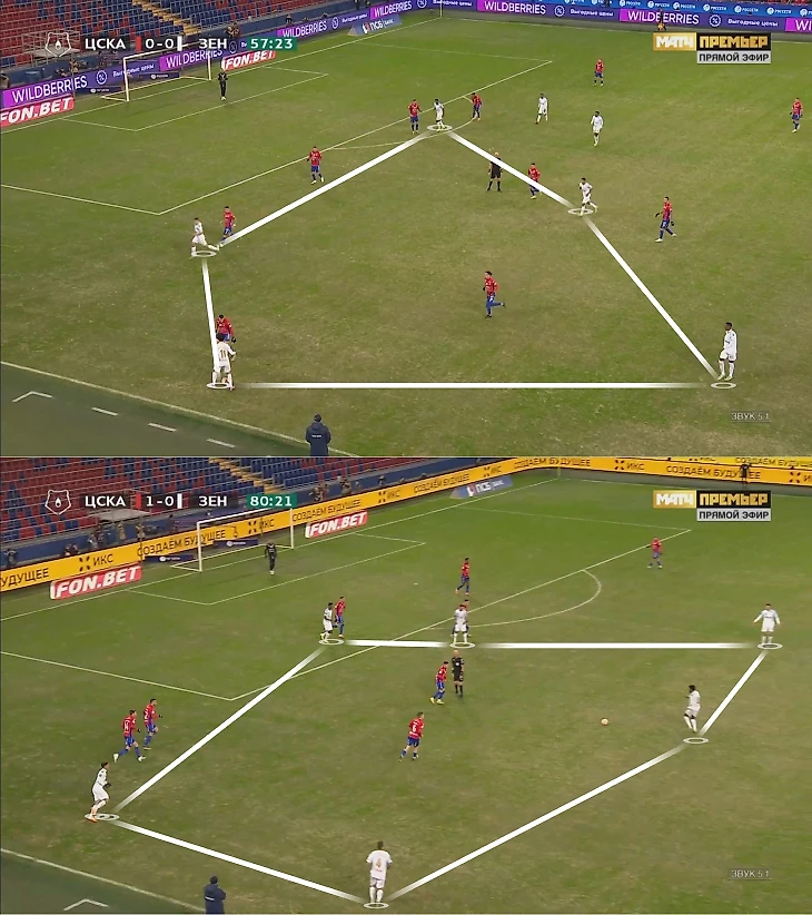 Крайние центральные защитники выдавливали Малкома, Клаудиньо, Кузяева и Вендела из штрафной, а при фланговых атаках ЦСКА численно превосходил «Зенит» – из-за плотности продвижение сильно тормозилось. Периодически работали смещения Кузяева или блуждание Малкома, но акцентированной фланговой игры почти не было, центр хорошо прикрывали, поэтому инициатива «Зенита» была стерильной.