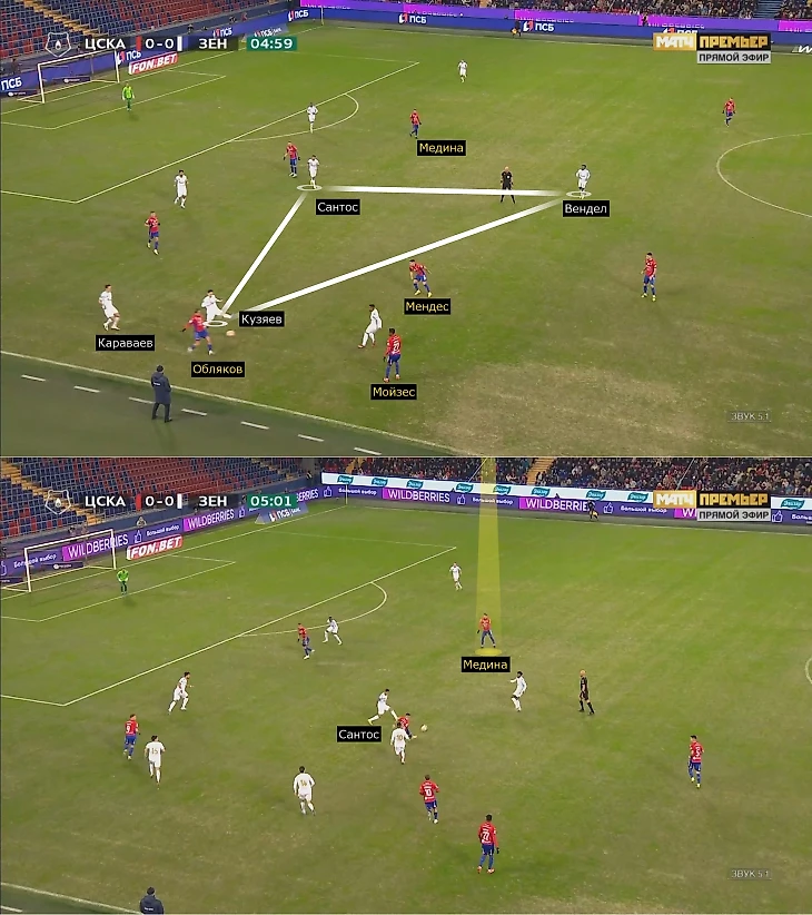 Следующая деталь – заточенность на подборы и игру с оппонентами до упора. В этом эпизоде помог Обляков: Мойзес выиграл единоборство у Малкома, а Иван опередил Караваева и Кузяева. Далее помогли целенаправленные открывания: Мендес принял мяч и катнул на свободного Медину. В подобных эпизодах максимально ощущалось отсутствие Барриоса – агрессия Вильмара и его умение руководить обороной часто гасили подобные вспышки соперников.