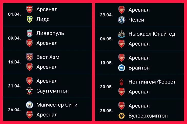 Команда Артеты уходит на международный перерыв с 8-и очковым отрывом. И пусть у «Сити» ещё игра в запасе. С точки зрения психологии – это важнейший момент. Впереди 10 туров. Очень тяжёлых туров. На пикче – расписание. Из 10-и таких матчей в прошлом сезоне «Арсенал» проиграл 6, включая слив в Кубке Англии от «Фореста».