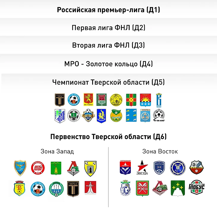 В нашем регионе два уровня - высшая лига и первый дивизион, который разделен на две зоны. В высшей лиге играет 16 команд и еще 20 в первой лиге. Итого 36 команд. Сезон играют по системе весна-осень. Так же проводится кубок Тверской области по футболу с участием всех 36-ти команд. Организует и проводит турниры федерация футбола Тверской области.