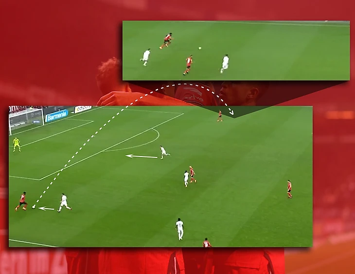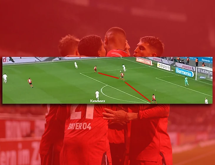 Благодаря интересным взаимодействиям на фланге «Байер» раздражал «Баварию» своим владением, а также создавал опасные моменты у чужих ворот. Например, опускания Диаби доставляли довольно много хлопот защитникам соперника. Мусса, разыгрывая треугольник, на дриблинге продвигал мяч через полуфланг, после чего делал обостряющую передачу. Его движение в центр поля компенсировал латераль «Леверкузена» Фримпонг, он своевременно поднимался по бровке и даже смещался в центр.