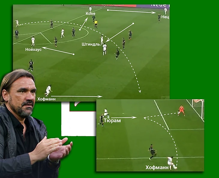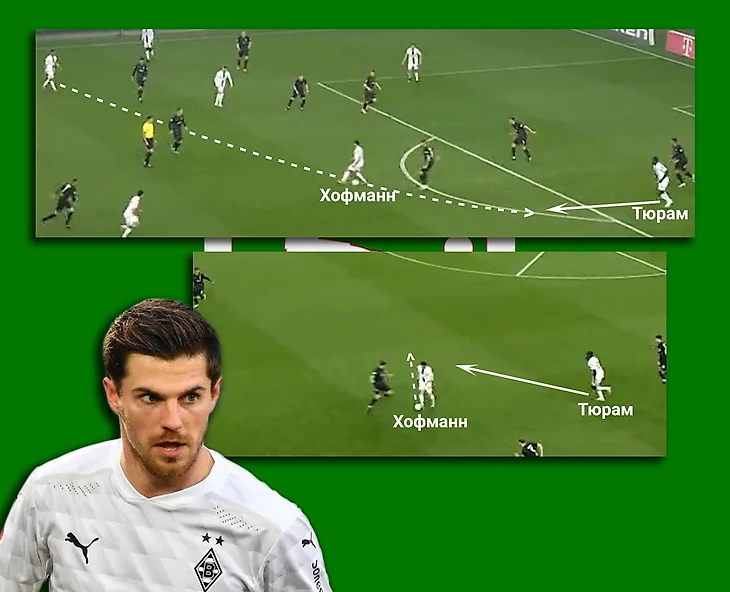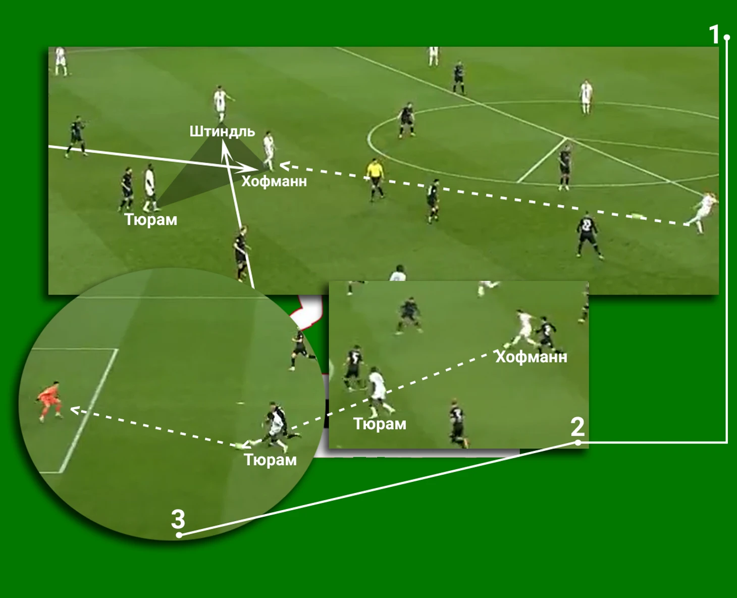 Во втором тайме Фарке перестроил схему на 3-4-2-1, где под Тюрамом стали играть Хофманн и Штиндель, которые в начале матча начинали на флангах. Атакующее трио классно взаимодействовало между собой. На картинке ниже обе «десятки» нашли свободную зону. Ответственность за выведение Тюрама на удар возьмет Йоанас. Немец отдаст передачу точно в дальнюю ногу французу, который, к сожалению, не реализует момент.