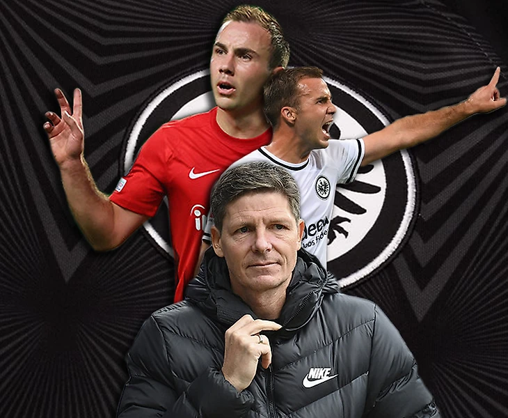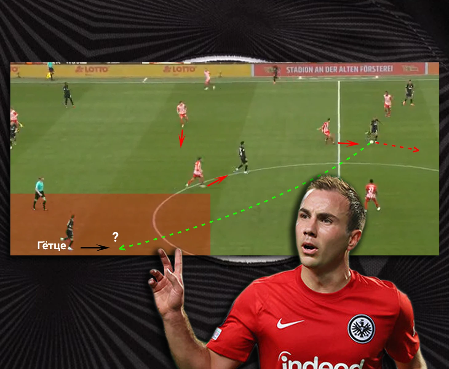 На следующем примере «Айнтрахту» снова удастся стянуть полузащитников соперника, чем попытается воспользоваться Марио Гетце. Немец предложит себя под передачу в свободном полуфланге, к сожалению, партнер не рискнет наградить его пасом.