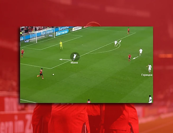 Здесь Мане машет Горецке, чтобы тот помогал в давлении. Увы! Леон не успеет сблизиться с защитником.