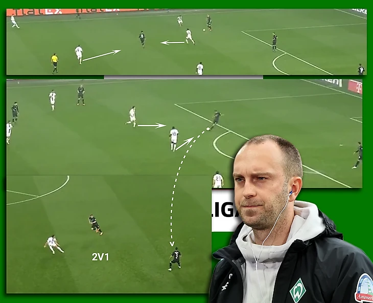 На картинке ниже можно увидеть, как игроки «Гладбаха» вдвоем накрывали одного соперника, причем дважды! Из-за неслаженной работы «жеребят», игроки «Вердера» переводом мяча на другой фланг нашли ситуацию 2v1, в которой вышли победителями и продвинули мяч в следующую стадию атаки.
