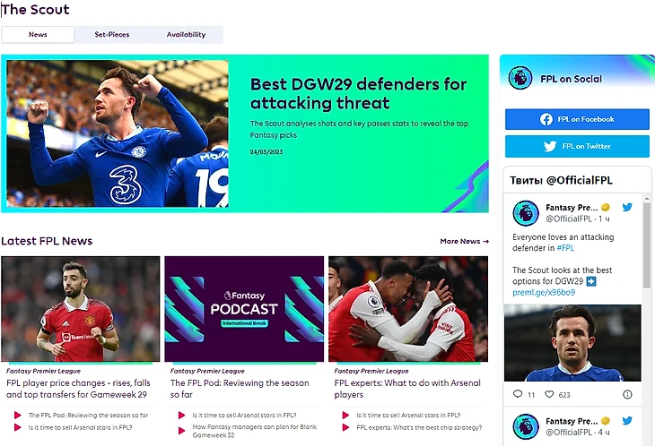 Новости - это актуальные статьи и подборки от авторского состава редакции (например, «Лучшие атакующие защитники» или «Что делать с игроками Арсенала») и твиттер-лента FPL. Если вам не нравится читать много букв, есть раздел с видеороликами по типу «Лучший третий нападающий в помощь Холанду и Кейну».