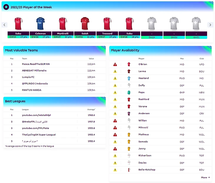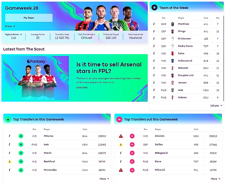На стартовой вкладке расположена информационно-статистическая сводка по итогам завершившегося тура. В отличие от родного спортса бросается в глаза многообразие информации. По большому счету, здесь можно найти всё необходимое для подготовки: команда недели, топ футболистов по набранным очкам, списки популярных трансферов, информация о доступности игроков (травмы, дисквалификации, под вопросом), статистика составов и др.