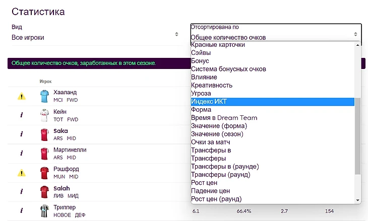 Что немаловажно, при использовании фильтра для поиска футболиста можно выбрать как суммарное значение ICT, так и каждый показатель в отдельности.