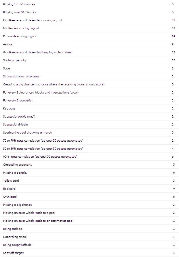 Базовая таблица подсчета очков отличается только одним пунктом: FPL отнимает 2 ФО за автогол. И это все? Нет:
