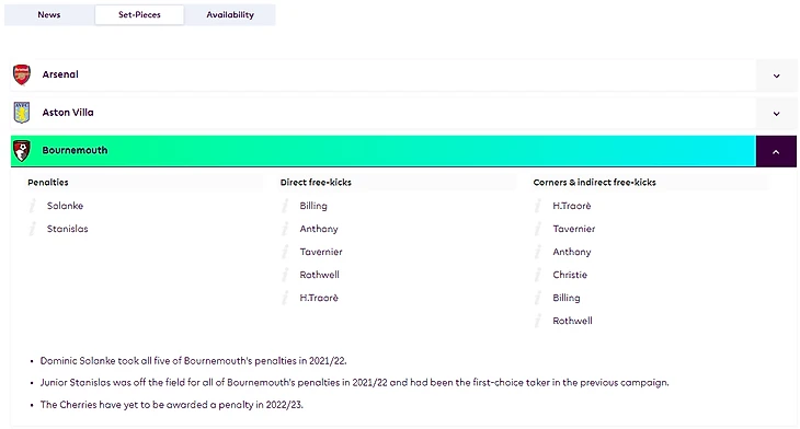 Set-pieces - здесь можно посмотреть исполнителей стандартов каждого клуба с учетом текущих реалий с подробным комментарием редакции.