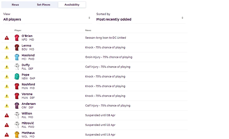 Доступность ожидаемо дает информацию о футболистах, чье участие в предстоящем туре сомнительно (или невозможно) и по какой причине.
