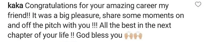 Кака: «Поздравляю с твоей невероятной карьерой, мой друг! Было очень приятно делить с тобой многие моменты на поле и за его пределами! Всего самого лучшего в твоей новой жизненной главе! Да благословит тебя бог».