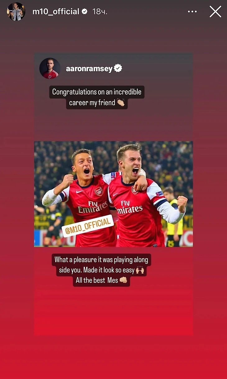 Аарон Рэмзи: «Поздравляю с невероятной карьерой, мой друг. Какое же удовольствие было играть рядом с тобой. Сделал так, чтобы это выглядело легко. Всего самого лучшего».