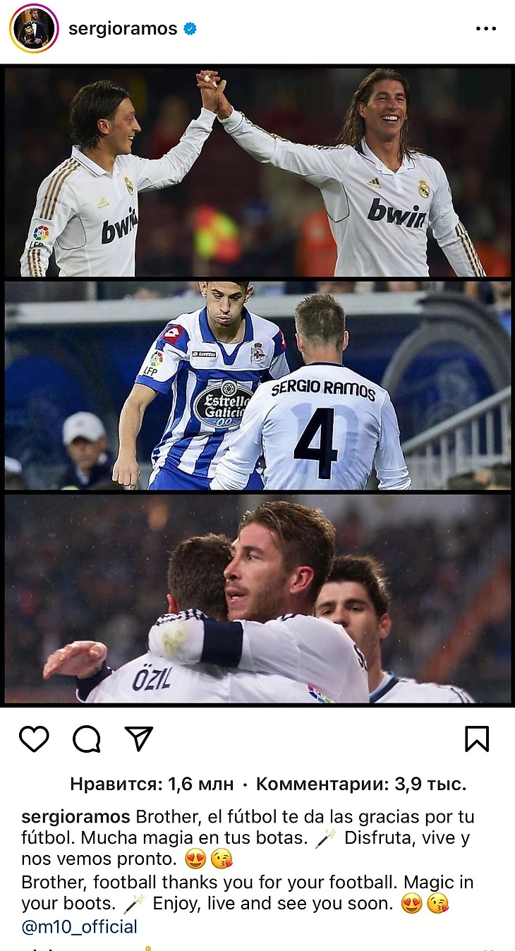 Серхио Рамос: «Брат, сам футбол благодарен тебе за твой футбол. В твоих бутсах столько магии. Наслаждайся, живи, скоро увидимся».