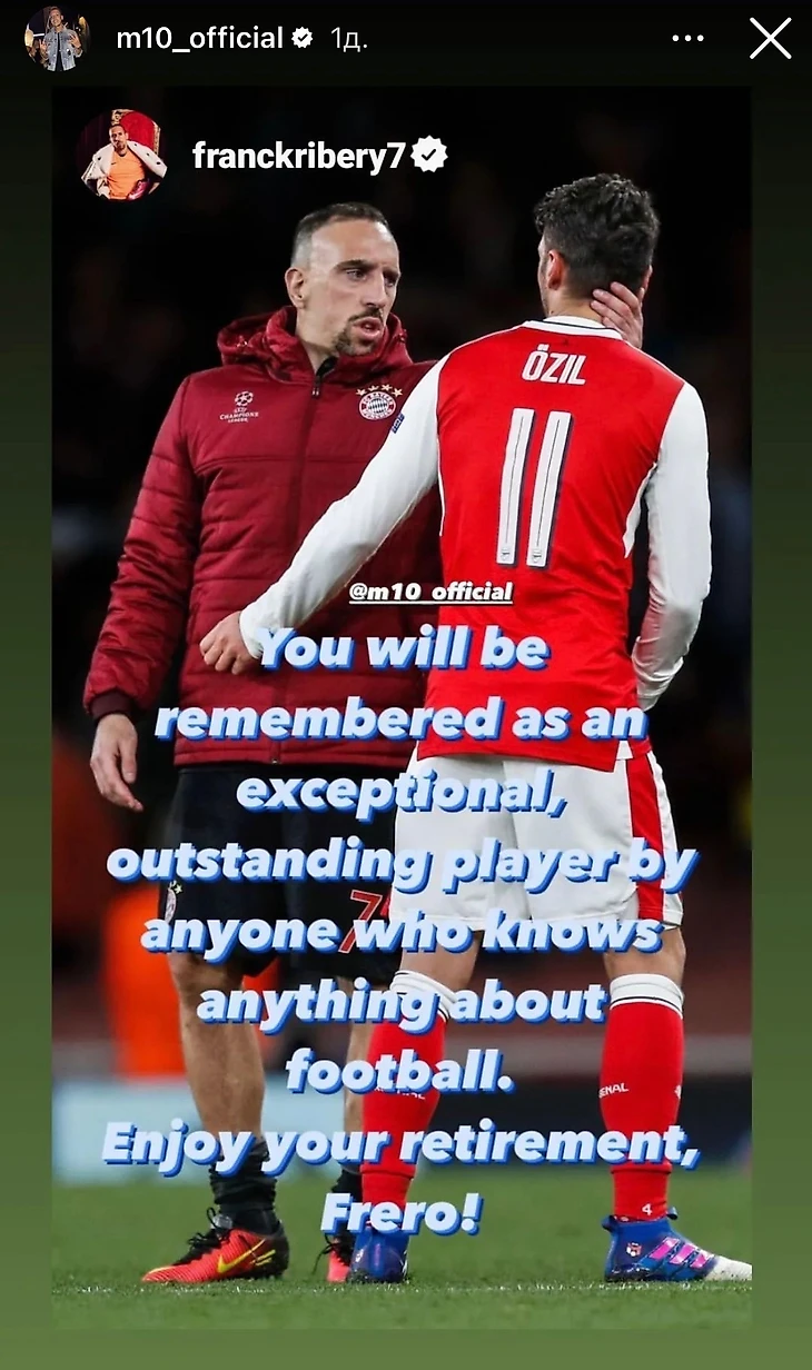 Франк Рибери: «Все, кто хоть что-то смыслит в футболе, запомнят тебя как исключительного, выдающегося игрока. Наслаждайся своим выходом на пенсию, братишка».