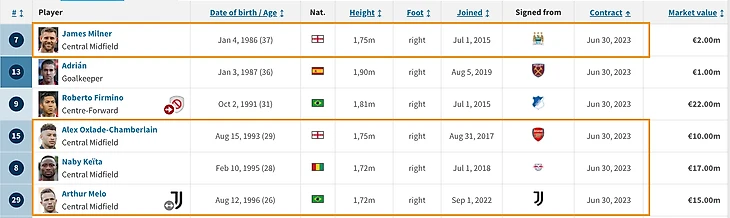 На текущий момент в конце сезона 22/23 истекают контракты у четырех номинальных игроков центра поля и это Джеймс Милнер, Наби Кейта, Алекс Окслейд-Чемберлен, а также Артур Мело.