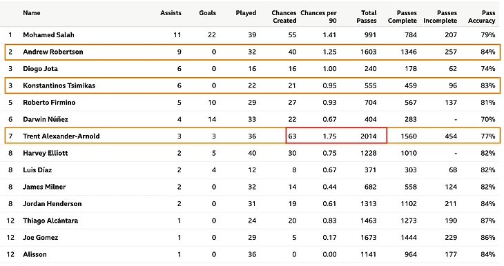 Много критики в этом сезоне вылилось на Трента Александра-Арнольда, каждый второй не доволен англичанином. Мол, по статистике он меньше ассистирует (3 голевые передачи в 36 матчах), чем раньше (сезон 21/22 - 19 голевых за 47 игр), а голы в наши ворота залетают, и залетают.