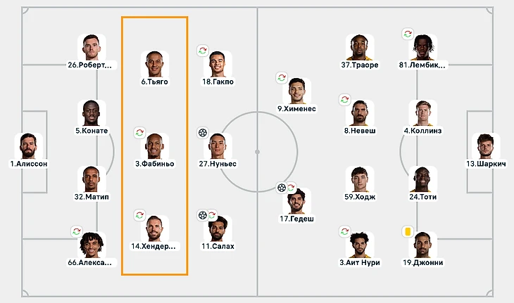 Переходим к "команде 30+", и в центре поля мы имеем Фабиньо (30 лет стукнет в этом году), Тьяго Алькантара (в апреле 32 года и год по контракту) и Хендерсона (в июне 33 года).