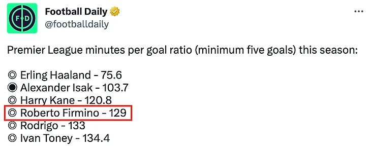 Таким в моих глазах был Роберто Фирмино, который раньше меньше других транжирил моменты. Да и текущем сезоне по статистике бразилец находится в топе премьер лигиему требуется 129 минут на 1 гол, к примеру у того же Кейна после матча с Саутгемптоном - этот показатель 121 минута.